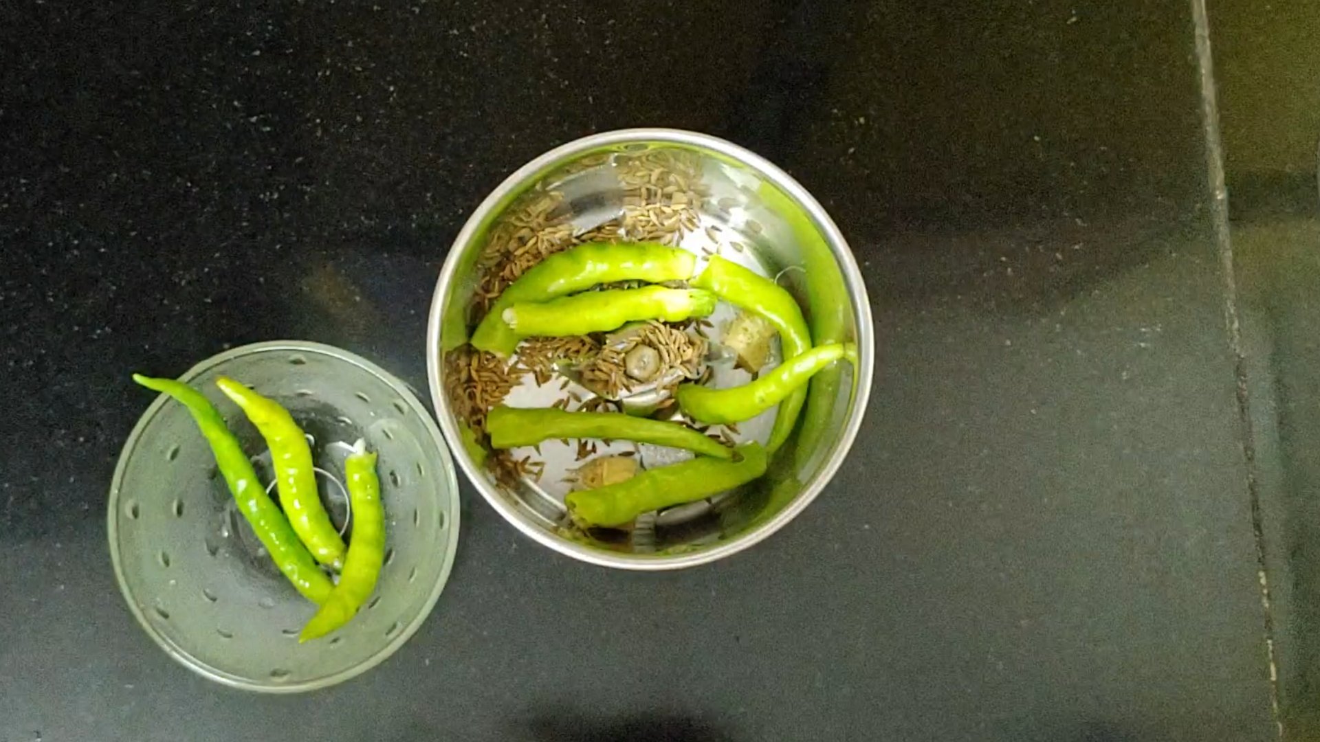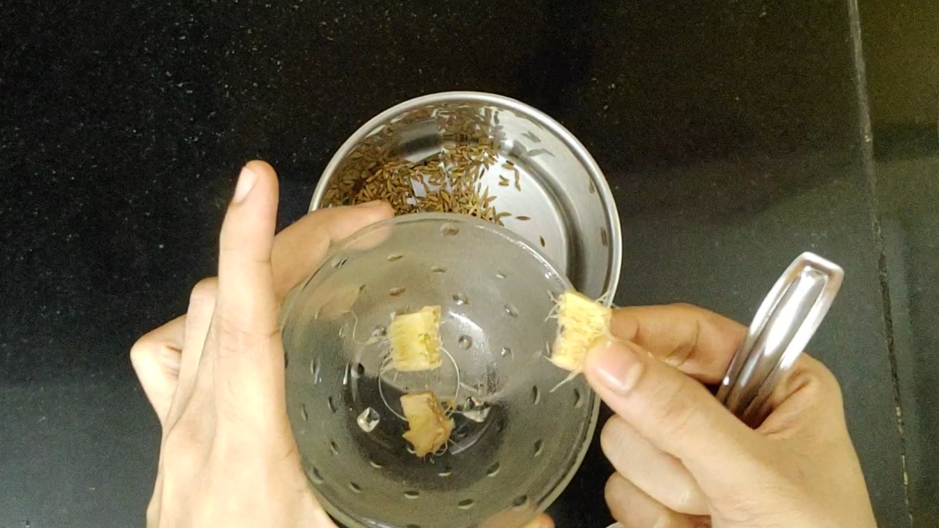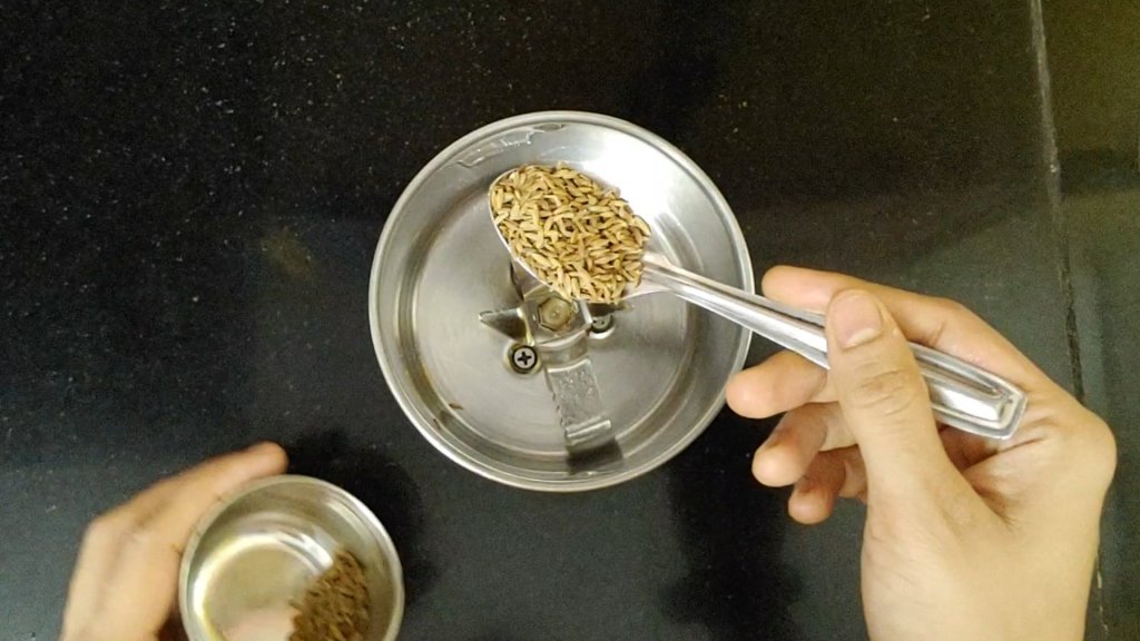 सर्वप्रथम एक चमचा भाजलेला जीरा, आळ्याचे 2 लहान तुकडे आणि 3 मिरची घेऊन मिक्सरला वाटून त्याचा बारीक कूट करून घ्यायचा आहे.