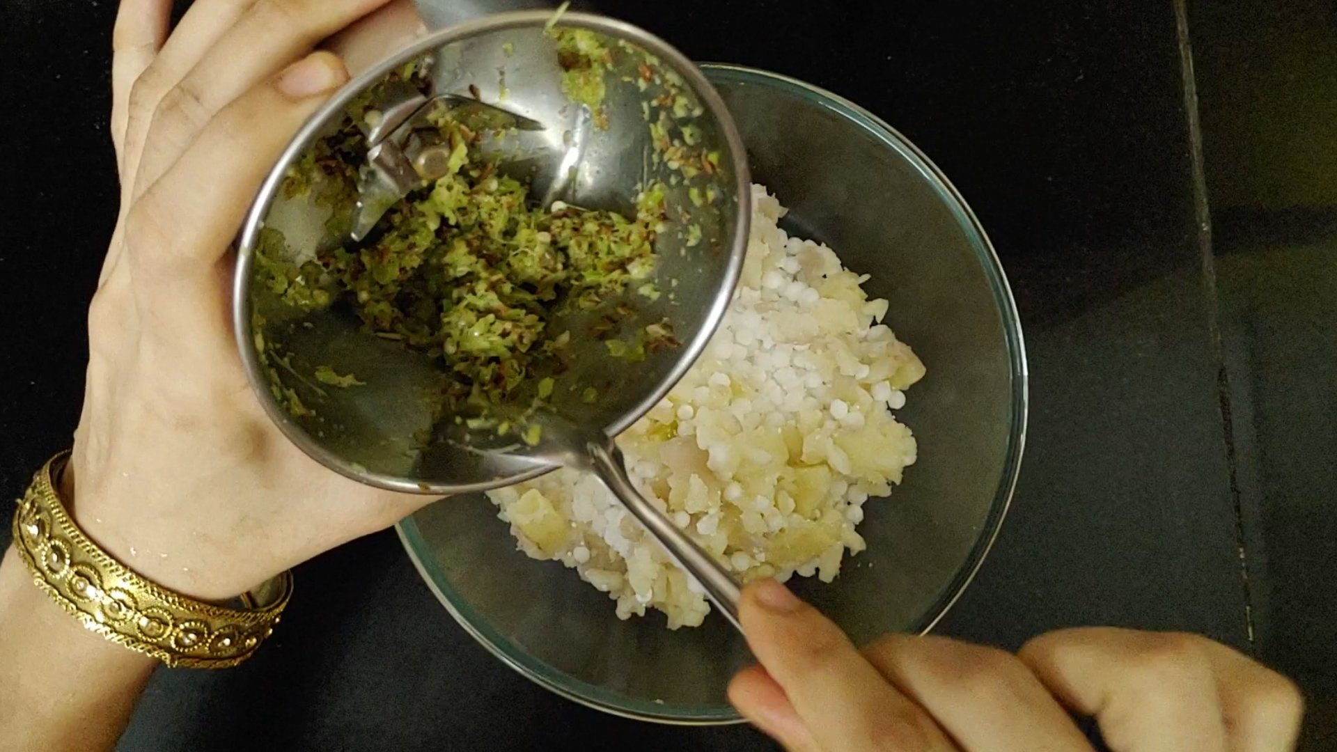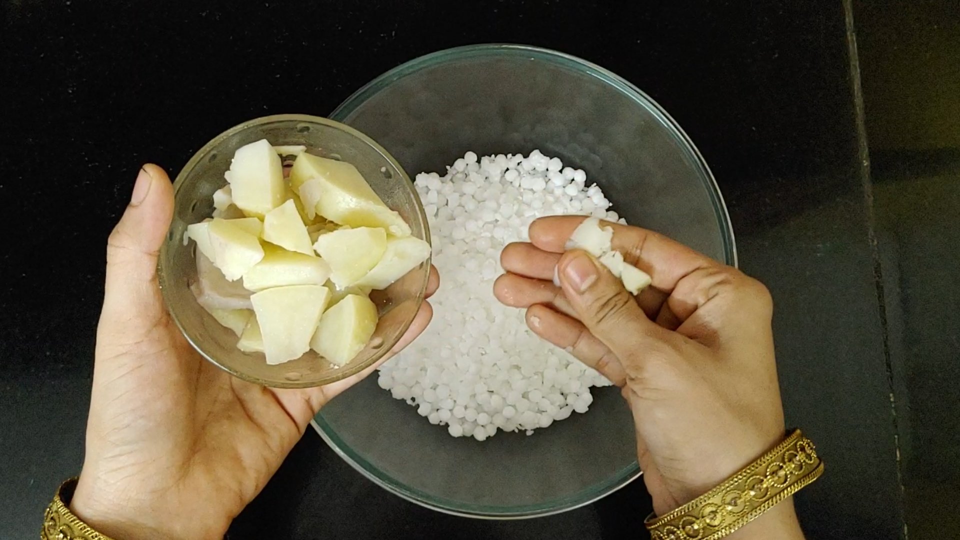 2) नंतर एक वाटी साबुदाणा घेऊन त्यात उकडलेला बटाटा कुस्करून घ्यायचं आहे. नंतर त्यात आधी वाटून घेतलेलं तिखट कूट मिक्स करून घ्यायचं आहे.