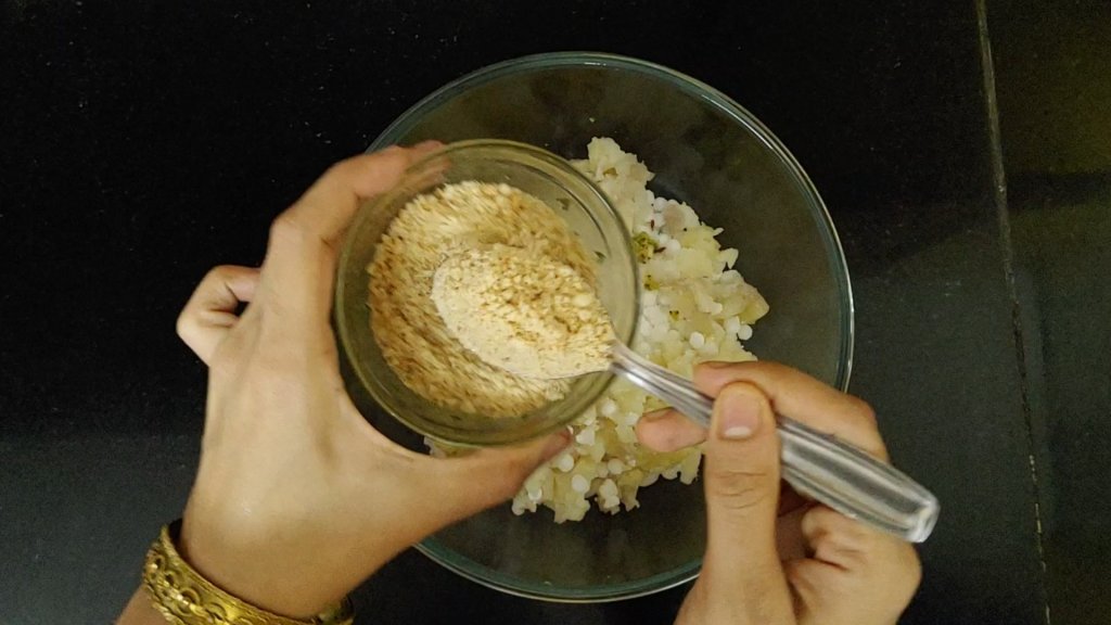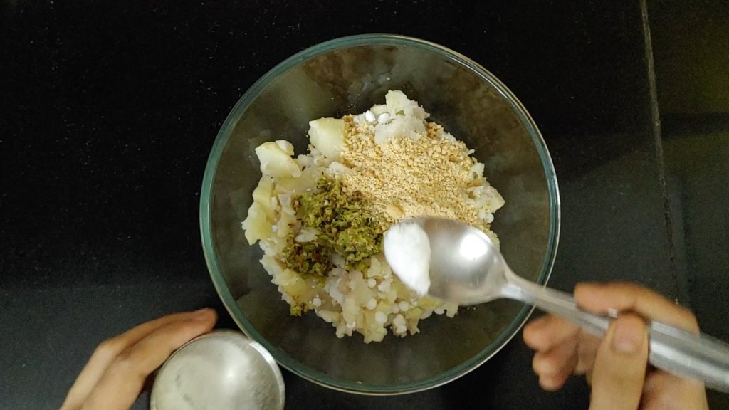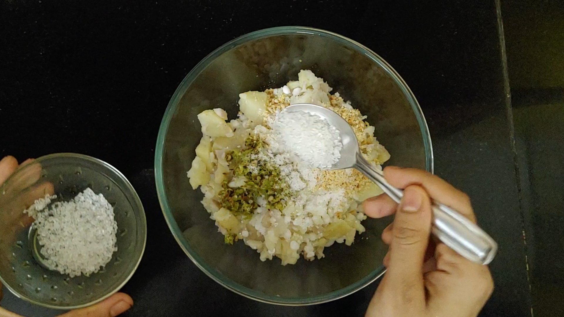 3) त्यानंतर 3 चमचे भाजलेल्या शेंगदाण्याचा कूट, चविप्रमाणे मीठ आणि 1 चमचा साखर घ्यायची आहे