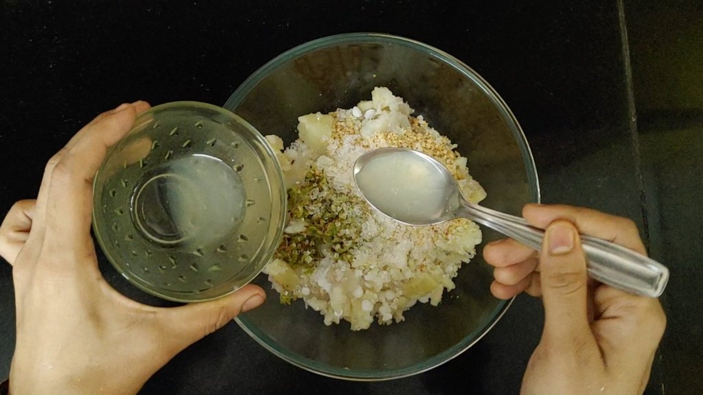 4) 2 चमचे लिंबाचा रस घ्यायचं आहे. आता हे सर्व मिश्रण चपातीचा पीठ मळतो तसा मळून घ्यायचा आहे. चांगल मळून झालं की हाताला थोडंसं पाणी लावून गोल वडे मळून घ्यायचे आहेत.