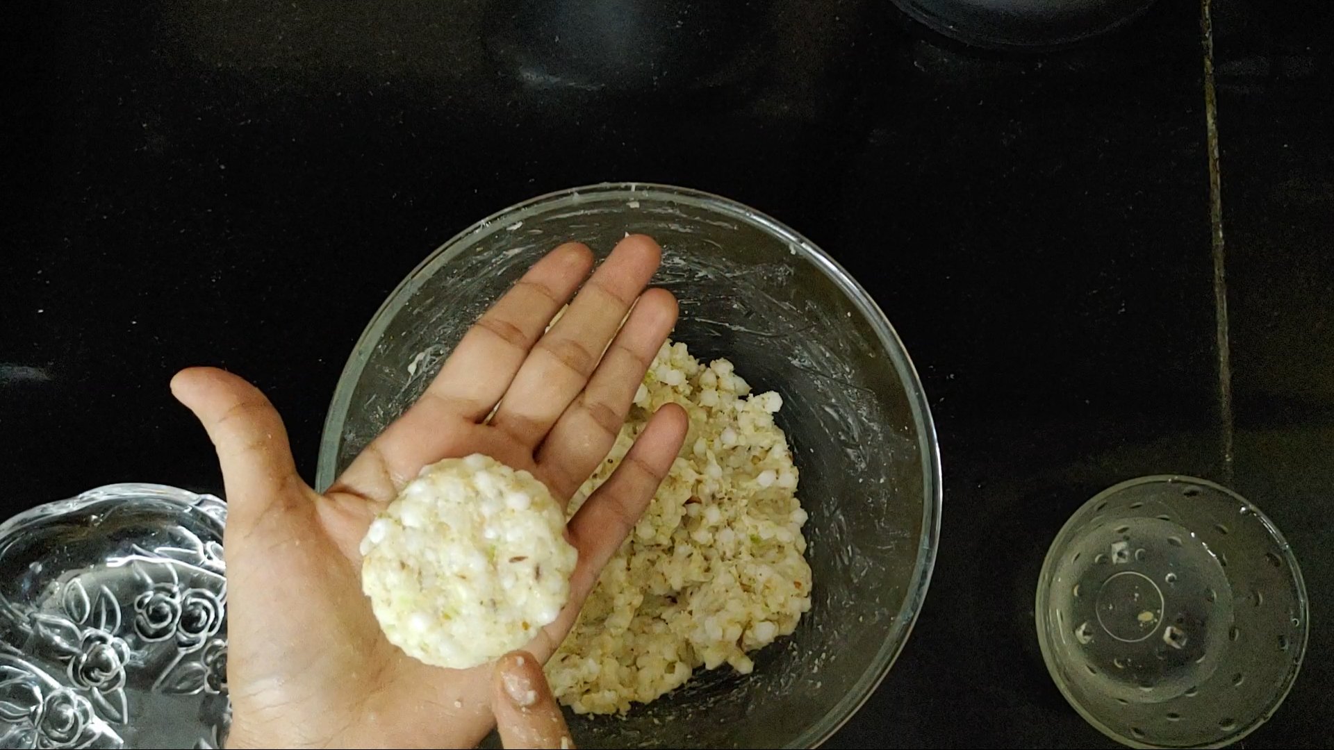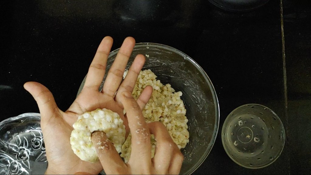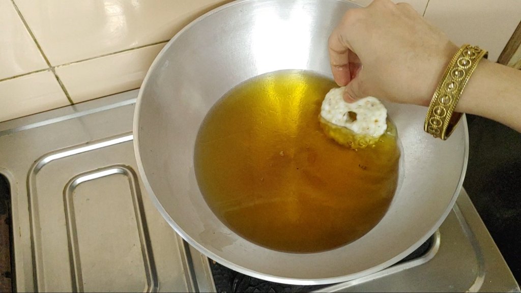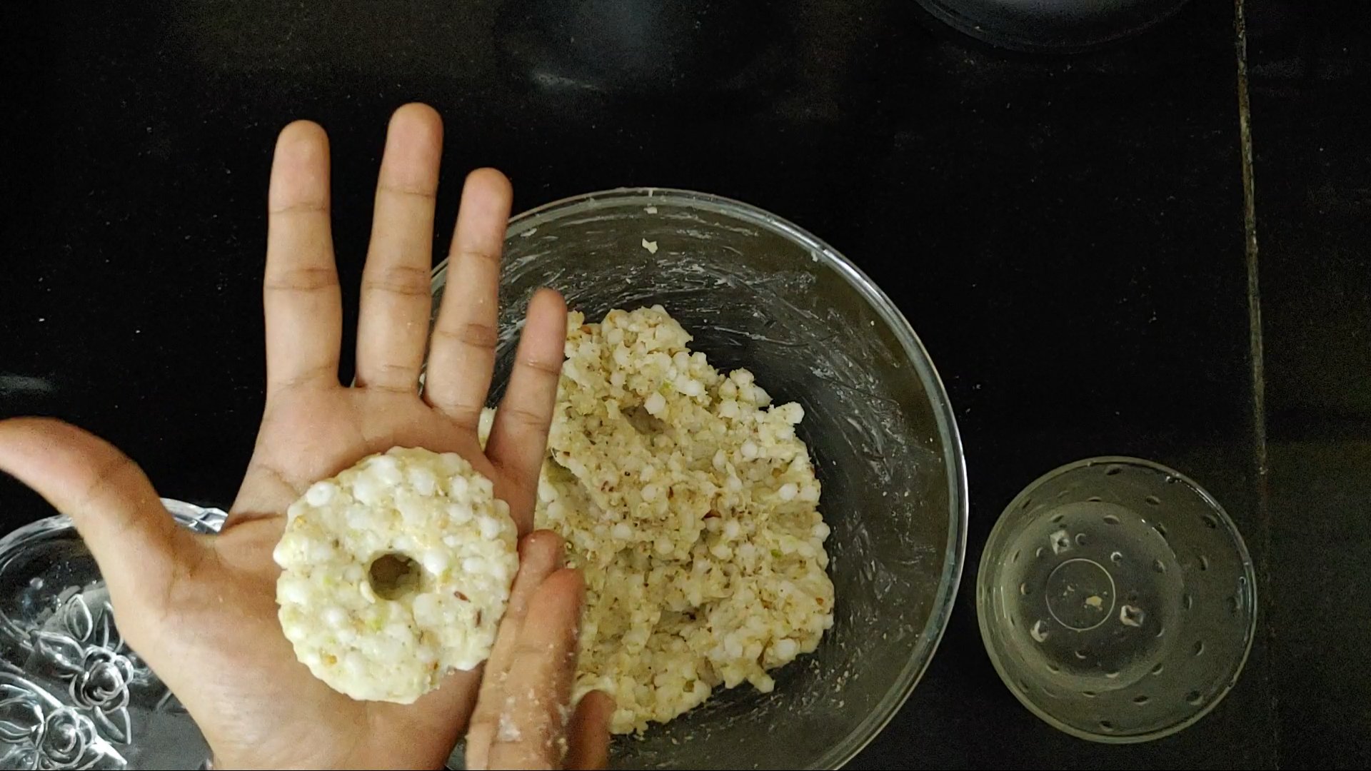 5) गोल असा वडा मळून झाला की त्याला मधून बोटाने छिद्र पाडून घ्यायचं आहे. मध्यभागी छिद्र पाडून घेतल्याने वड्याचा मधला भाग देखील व्यवस्थित तळला जातो, ज्याने वडे खूप कुरकुरीत होतात.